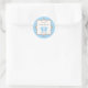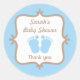 Este doce adesivo azul redondo apresenta um adorável par de pés de bebê azuis em um quadro marrom-claro, com o seu texto em uma frente marrom correspondente. Coordenação de produtos disponíveis. Cortesia gráfica de www.jessicaweible.com