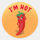 Um personagem de desenho animado de pimenta vermelho e quente. Design original. Versão com texto personalizável e fundo de gradação. Este adesivo pode ser utilizado em garrafas de molho e outras comidas picantes. Por diversão e como sinal de aviso. Vazio atrás para mensagens escritas à mão.