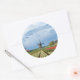 Um autocolante fotográfico redondo de uma paisagem com um moinho de vento e tulipas amarelas e vermelhas sob um céu nublado no campo holandês, num belo dia de primavera na Região do Bulb, Países Baixos.