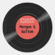 Um adesivo redondo de estilo retro vinil retro-colorido vermelho personalizado com seu monograma e nomes. Este adesivo adiciona um detalhe adicional como um selo de envelope ou pode ser usado como um toque decorativo personalizado em embalagens de favor ou outros artigos de papelaria de casamento ou de recepção. Melhore o tema clássico do vinil de sua celebração, seja qual for o seu DJ: country, disco, hip hop, metal, rock and roll, ou padrões, as cores de rótulo e texto podem ser personalizadas na Ferramenta de Design. A cor do registro é preta. Parte da coleção Hello Penas Rosa Vinil para Music Lovers.