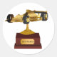 Um autocolante de troféus de corrida de ouro brilhante, com gráficos de um carro de corrida de tom dourado sobre uma base de troféus, com texto personalizado, na placa. Personalize o texto para ler o que quiser. Perfeito como favores de festa de aniversário ou adesivos de prêmio para a festa de aniversário do garoto temido de um carro de corrida.