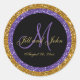 Versátil, monograma personalizado e elegante selo de envelope de casamento com um círculo brilhante roxo e dourado, letra elegante para o sobrenome inicial e noiva e design de noivo num fundo preto. Estes autocolantes monográficos personalizados podem ser usados para salvar as datas, convites para casamento e cartões de agradecimento. Também o excelente usa como adesivos modernos e contemporâneos de glam para o casamento. O brilho é um efeito fotográfico impresso. Outras cores disponíveis no nosso compro em www.zazzle.com/monogramgallery