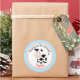 Etiquetas brancas com design de vaca (animal Fazenda) em fundo bolinhas azul.