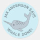 Um narval giro sobre um fundo azul-marinho claro. O texto diz "Mx Anderson diz baleia feita!" e pode ser alterado para um nome/mensagem personalizado. Ideal para professores como recompensas para estudantes.