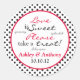 Bolinhas brancas e vermelhas de cereja, pretas e brancas personalizadas, adesivos de bufê de doces que são perfeitos para um casamento ou chá de panela. Você pode personalizar os nomes e a data do casamento usando personalizar. Você pode alterar qualquer outro texto também na seção personalizá-lo. Certifique-se de obter o tamanho desejado com estes, pois há dois tamanhos disponíveis. Chic e na moda.