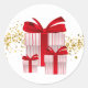 Este autocolante redondo de pequeno tamanho é mostrado com um impressão festivo de pacotes de Natal. Personalize este item ou comprar como está.