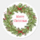 Este adesivo redondo de tamanho pequeno é mostrado com um impressão festivo de wreath de Natal. Personalize este item ou comprar como está.