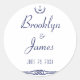 Etiquetas de casamento náuticas redondas com âncora azul e texto impresso em fundo branco