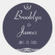Etiquetas de casamento náuticas redondas com âncora branca e texto branco impresso em fundo azul marinho com padrão de âncora
