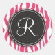 Estes adesivos adoráveis apresentam um fundo de impressão em zebra rosa e branca. Por cima está um círculo de cinzas escuras com uma borda branca. Personalize a letra dentro do círculo para personalizar o produto.