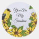 Envie uma mensagem feliz com um adesivo redondo alegre projetado com um jardim de girassóis e pássaros dourados. O versículo encantador "Você é meu sol" é uma citação adorável que combina com a brilhante imagem de uma flor e de um pássaro amarelo, branco e verde.