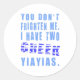 A imagem divertida lê em letras azuis, angustiadas, VOCÊ NÃO ME AMIGA. EU TENHO DOIS YIAYIAS GREGOS. A palavra YIAYIAS está em uma faixa azul e branca mais escura para corresponder à bandeira da Grécia.