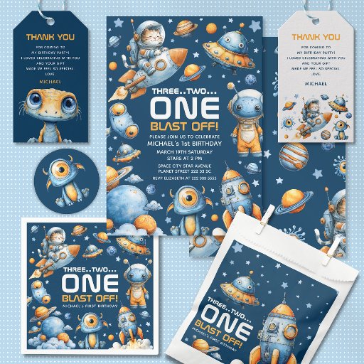 The artistic watercolor style gives it a modern, minimalist look, while the cute cyclops alien adds a fun and friendly vibe that little astronauts will adore. Perfect for favor bags, thank-you tags, invitations, or sticker sheets, this design is sure to make your celebration truly out of this world!