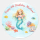 This watercolor mermaid clipart features a cute under-the-sea mermaid with flowing blonde hair, a turquoise tail, a purple seashell top, and surrounding coral, shells, and bubbles. Perfect for kids’ birthday invitations, party décor, and underwater-themed accessories.