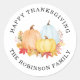Este adesivo clássico redondo de Ação de Graças apresenta lindas folhas coloridas de água e abóboras. É fácil personalizar todo o texto. Feliz Ação de Graças.