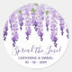 Watercolor Wisteria Wedding Spread The Love Script Favor Stickers apresenta flores elegantes de wisteria de cor d'água em lavanda macia e roxo com folhas verdes sobre fundo branco com sua mensagem de obrigado de casamento e a data abaixo. Ao contrário, há um lilás macio. Personalize editando o texto nas caixas de texto. Projetado para você pelo Evco Studio www.zazzle.com/store/evcostudio