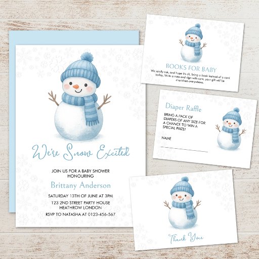 This design features winter baby shower theme "We're Snow Excited" with a cute watercolor snowmen in blue. This product can be easily personalized.