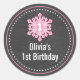 Floco de neve rosa personalizado Flocos de neve de inverno autocolantes de primeiro aniversario. Design apresenta um floco de neve cor-de-rosa sobre fundo do quadro. Perfeito para cupcakes ou adesivos para sacos de favorecidos.