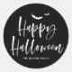 White Brussel Lettering Happy Halloween | Obrigado Clássico Do Adesivo Redondo. Mande saudações de Halloween para a família e amigos com este adesivo personalizável. Ele contém a inscrição do pincel com a ilustração do morcego. Este adesivo divertido e moderno do Dia das Bruxas é perfeito para convites, cartões e presentes e favores de festas. Personalize adicionando seus próprios detalhes.