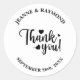 Apresentando nosso White Script Personalizado Moderno de Casamento Obrigado Clássico Round Sticker, uma mistura de elegância contemporânea e encanto personalizado. Este adesivo apresenta um roteiro branco nítido em um design redondo clássico, perfeito para adicionar um toque de na moda na sua papelaria de casamento. Personalize com seus nomes e data de casamento para criar uma manutenção única. Ideal para selar envelopes, decorar favores, ou expressar gratidão em notas obrigado-você, ele melhora a sofisticação e a personalização de suas celebrações de casamento com cada detalhe.