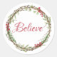 Vestido elegante e moderno e festivo, selante de presente para o Natal, com o texto "Acredite" na caligrafia vermelha e um verde-inverno na moda e uma coroa de frutas. Desenvolvido exclusivamente para você pelo Happy Dolphin Studio. Se precisar de ajuda ou produtos correspondentes, entre em contato conosco em happydolphinstudio.com.