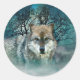 Lobo Bonito numa Noite Foggy com uma Arte de Lua Cheia. Com tons azuis e árvores nas costas. Wolf art com imagem de foto vívida de cores azuis.