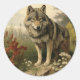 Imagem fantástica e vintage de um lobo parado em um campo, é mostrada neste adesivo redondo. Use este adesivo para cartazes especiais, decoração, raspagem e muito mais! Excelente para fãs da natureza e lobos também.