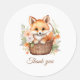 Add a sweet finishing touch to your baby shower favors with this adorable woodland fox thank you sticker. The cute baby fox sitting in a basket brings a warm and charming look to gift bags, envelopes, and party treats. Personal and heartfelt, this round sticker is perfect for decorating favors or adding a special note of thanks. Easily customized with your details if you choose.