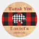 Rústico, jack de lenhador, o tema festa de aniversário favorece autocolantes- Leia 'Obrigado' em letras rústicas, carimbadas, que parecem vermelhas no topo. Nome personalizado e aniversário na parte inferior do olhar manuscrito, letras vermelhas correspondentes. Centrado é uma faixa de xadrez de lenhador rústico, em vermelho e preto. No meio está uma sombra de búfalo preto e branco. Papel russo, antigo ou papel kraft castanho parecem fundo. Festivo, divertida festa de urso favorece adesivos. Temos outro decorador de lenhador bonitinho e suprimentos de festa de aniversário rústicos em nosso compro Zazzle.com/angela65*. Clique na opção Personalizar para alterar as cores do texto, o tamanho e os estilos de fonte para corresponder à decoração da sua parte. Perfeito para festas de aniversário de lenhador, chás de fraldas rupestres, festa temática de ursos, etc.