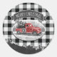 Estes autocolantes de Natal apresentam uma cena de inverno de um caminhão vermelho vintage que atravessa a neve com uma árvore de Natal atrás. Um cartaz acima diz "Feliz Natal" que pode ser guardado como está ou personalizado como um nome. O fundo é um padrão de xadrez de búfalo preto e branco com uma borda de pinheiros. Projetado por artista mundialmente renomado © Tim Coffey.