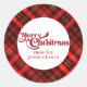 Um padrão clássico de tartan vermelho-xadrez por trás da sua mensagem de Feliz Natal com seu nome de família personalizado em adesivos de presentes. Um autocolante festivo e tradicional.