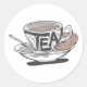 Ilustração de um teacup em um disco de porcelana, com uma panela ou biscoito e uma colher de chá. Uma foto para amantes de chá, desenhada em estilo retrô com meio-tom.