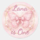 Personalize your little girl’s first birthday celebration with this elegant pink butterfly round sticker. Featuring a satin bow, gold frame, and soft pearl details, this design is perfect for butterfly birthday party favors and pastel-themed celebrations.