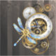 Marcações antigas com engrenagens de ouro e latão, decoradas com libélula mecânica sobre fundo castanho e listrado. Steampunk.
