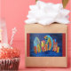 Uma pintura colorida, divertida e peculiar usando cores azuis, vermelhas, amarelas e laranja e retratando edifícios tortos flutuando na água.