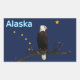 Uma águia careca varreu o céu de sua perca em um galho de árvore; sobreposto a uma bandeira do Alasca. A leitura de texto "Alaska" também aparece em azul e branco brilhantes.