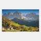 Tampão de fotografia retangular de souvenir da Rua da aldeia. Magdalena com a sua igreja no Villnoesstal, no Sul do Tirol, Itália, durante a temporada de outono, com as montanhas Geisler Dolomites ao fundo.