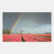 Um adesivo fotográfico retangular com um arco-íris colorido num céu escuro sobre um moinho de vento e um cheio de campo de tulipas vermelhas brilhantes durante uma tempestade primavera num cenário perto de Amsterdã, nos Países Baixos.