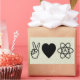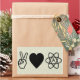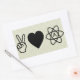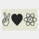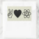 Uma mão erguida em um sinal de paz "V", um coração, e um símbolo ateu soletra "Ateísmo de Amor pela Paz".
