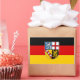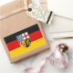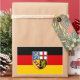 Vinheta com bandeira de Sarre; design com tricolor horizontal a preto, vermelho e amarelo (ouro), com casaco de braços do Estado no centro