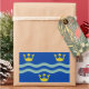 Vinheta com design com uma bandeira do condado histórico de Cambridgeshire, na Inglaterra, Excelente-Bretanha; bandeira azul com três coroas ouros e duas ondas