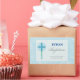 Presente perfeito de batismo, lembrança, doação ou essência do partido para felicitar um menino enquanto é batizado. A olhadela na frente está sobreposta em azul claro e envia bênçãos a ele. Uma cruz mostra a natureza cristã ou católica do evento religioso especial.