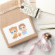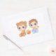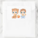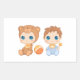 Bebês bonitos de desenho animado em rompers. A da esquerda está vestida com um macacão de urso marrom com uma bib amarela com uma pequena abelha. A da direita está vestida com um pano azul com uma bib amarela e segurando um bebê chocalho. A bola brilhante está descansando entre eles.