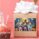 Uma cena divertida de Halloween, com um cachorrinho malicioso a espreitar-se de uma abóbora esculpida, rodeada por vibrações de outono assustadoras. Com um charme viscoso e cores de outono, é o toque perfeito de humor para a estação.