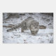 Filhote de leopardo-da-neve perseguindo pássaros em um campo de inverno de neve.