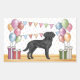 A ilustração original do desenho de Destei de um lindo cão negro da raça Labrador Retriever. O cão é colocado num ambiente de aniversário colorido com balões de aniversário de cor pastel, presentes e uma faixa de bunting. As cores pastel incluem rosa, verde, azul, vermelho, laranja e roxo. O cachorro está parado sobre uma textura amarela de chão de madeira e o fundo tem um padrão de bolinhas pastel lúcido.