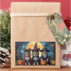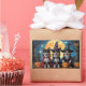 Uma cena divertida de Halloween, com um cachorrinho malicioso a espreitar-se de uma abóbora esculpida, rodeada por vibrações de outono assustadoras. Com um charme viscoso e cores de outono, é o toque perfeito de humor para a estação.
