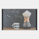 Um quadro atrás diz "tempo do café" com um smiley face, escrito em giz. Na frente, em uma mesa de madeira rústica, há uma caneca de café com um padrão de diamante design a preto e branco. Sentado ao lado da xícara de café está um pote de café com um filtro grande e um pote de café recém-fabricado. Parece rústico e antiquado.