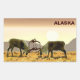 Dois touros de renas lutam durante a corrida de outono no extremo norte enquanto o sol se põe no fundo. O texto "ALASKA" também é exibido.