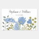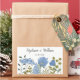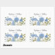 Favoritos para festas decorados e outros suprimentos de casamento com esses adesivos. Eles estão prontos para serem personalizados com os nomes da noiva e do noivo e sua data de casamento e apresentam uma ilustração simples e arejada de flores azuis periwinkle com sotaques verdes.